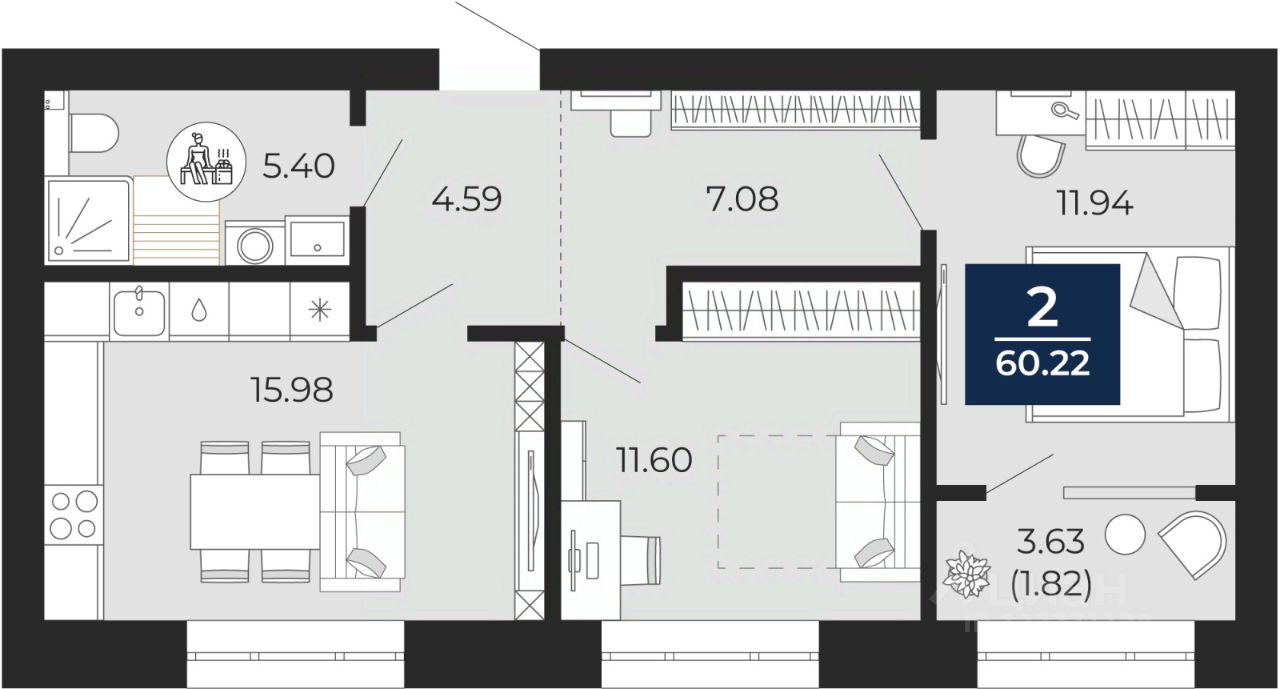 Двухкомнатная квартира от застройщика с предчистовой отделкой в ЖК "Преображенский" на 7 этаже. Общая площадь: 58.41 кв.м., жилая: 23.54 кв.м., площадь просторной кухни-столовой: 15.98 кв.м. Комнаты изолированные, все окна выходят на одну сторону. В квартире одна лоджия, один совмещенный санузел. Высота потолков 2.7 м.