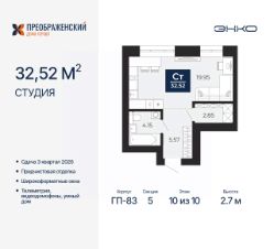 Продается 1-комн. квартира-студия с предчистовой отделкой в ЖК "Преображенский" на 10 этаже. Общая площадь: 32.52 кв.м., площадь гостиной 19.95 кв.м., из которых 5 кв.м. выделено под кухонную зону. Все окна выходят на одну сторону. В квартире один совмещенный санузел. Высота потолков 2.7 м.