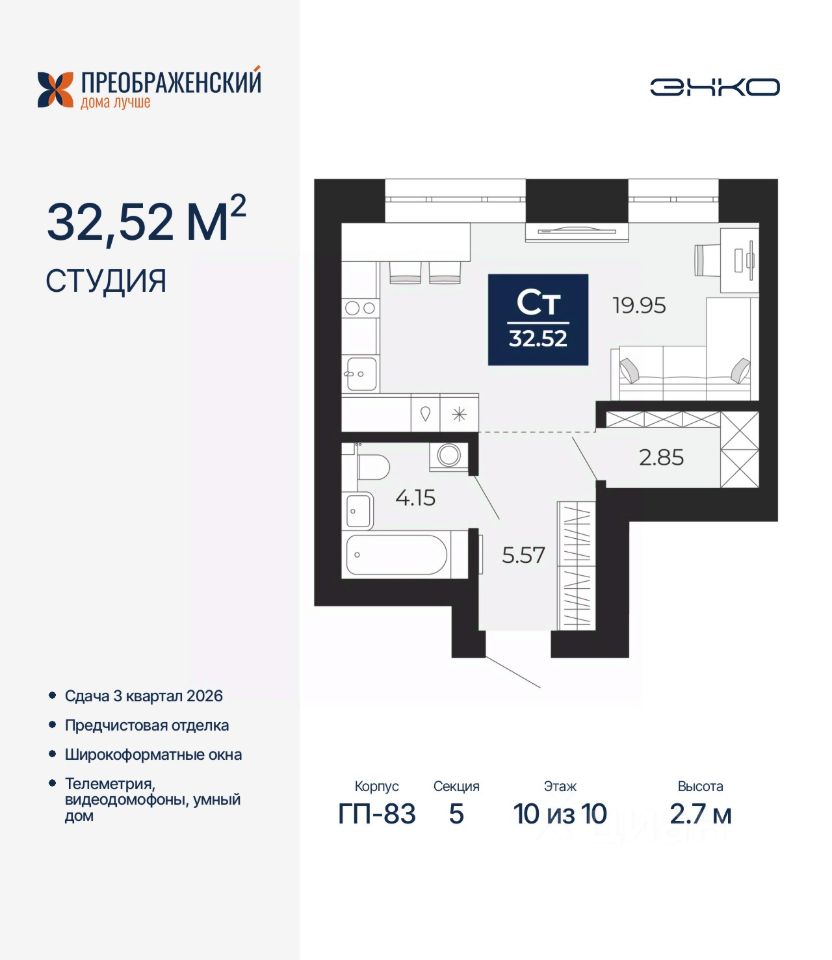Просторная 1-комн. квартира-студия с предчистовой отделкой в ЖК "Преображенский" на 10 этаже. Общая площадь: 32.52 кв.м., площадь гостиной 19.95 кв.м., из которых 5 кв.м. выделено под кухонную зону. Все окна выходят на одну сторону. В квартире один совмещенный санузел. Высота потолков 2.7 м.