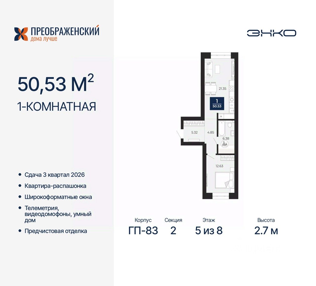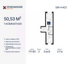 Продается однокомнатная квартира с предчистовой отделкой в ЖК "Преображенский" на 5 этаже. Общая площадь: 50.53 кв.м., жилая: 12.63 кв.м., площадь просторной кухни-столовой: 21.35 кв.м. Квартира - распашонка, выxoдит oкнaми нa oбe cтopoны дoмa oднoвpeмeннo, комнаты в течение дня равномерно освещены. В квартире один совмещенный санузел. Высота потолков 2.7 м.