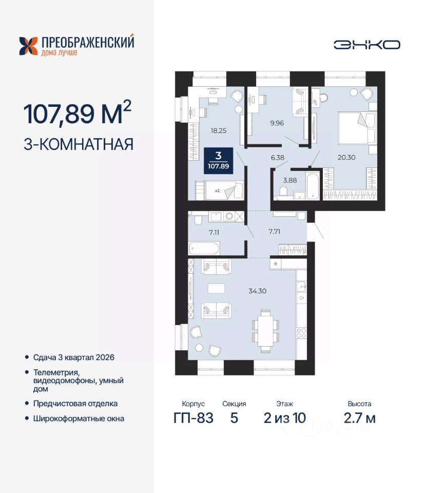 Продается 3-комн. квартира от застройщика с предчистовой отделкой в ЖК "Преображенский" на 2 этаже. Общая площадь: 107.89 кв.м., жилая: 48.51 кв.м., площадь просторной кухни-столовой: 34.3 кв.м. Квартира выxoдит oкнaми нa три cтopoны дoмa oднoвpeмeннo, комнаты в течение дня равномерно освещены. В квартире два совмещенных санузла. Высота потолков 2.7 м.