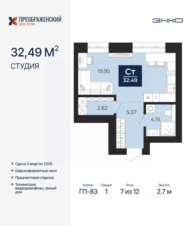 Просторная однокомнатная квартира-студия с предчистовой отделкой в ЖК "Преображенский" на 7 этаже. Общая площадь: 32.49 кв.м., площадь гостиной 19.95 кв.м., из которых 5 кв.м. выделено под кухонную зону. Все окна выходят на одну сторону. В квартире один совмещенный санузел. Высота потолков 2.7 м.