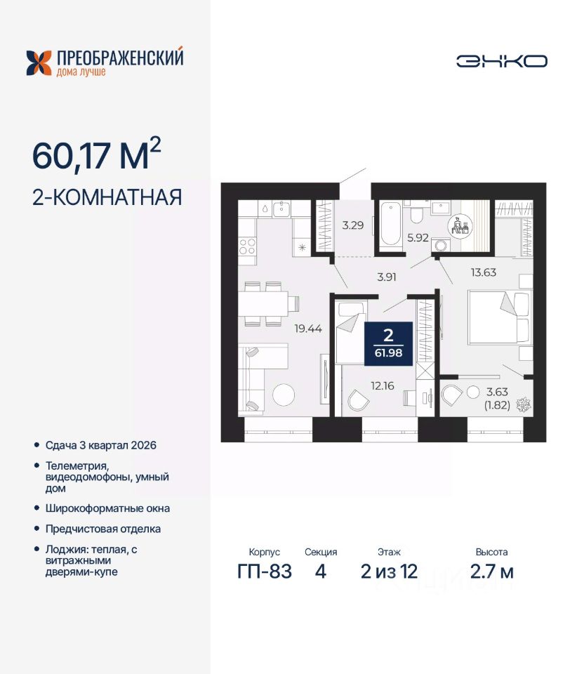 Продается 2-комн. квартира от застройщика с предчистовой отделкой в ЖК "Преображенский" на 2 этаже. Общая площадь: 60.17 кв.м., жилая: 25.79 кв.м., площадь просторной кухни-столовой: 19.44 кв.м. Комнаты изолированные, все окна выходят на одну сторону. В квартире одна лоджия, один совмещенный санузел. Высота потолков 2.7 м.