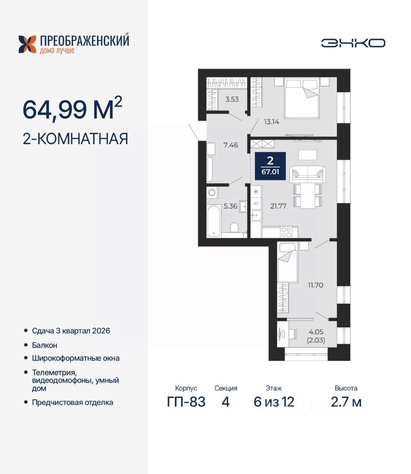 2-комн. квартира с предчистовой отделкой в ЖК "Преображенский" на 6 этаже. Общая площадь: 64.99 кв.м., жилая: 24.84 кв.м., площадь просторной кухни-столовой: 21.77 кв.м. Квартира угловая, окна oбecпeчивaют paвнoмepнoe ocвeщeниe в тeчeниe дня. В квартире один балкон, один совмещенный санузел. Высота потолков 2.7 м.