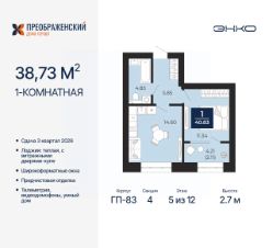 1-комн. квартира с предчистовой отделкой в ЖК "Преображенский" на 5 этаже. Общая площадь: 38.73 кв.м., жилая: 11.34 кв.м., площадь просторной кухни-столовой: 14.6 кв.м. Все окна выходят на одну сторону. В квартире одна лоджия, один совмещенный санузел. Высота потолков 2.7 м.