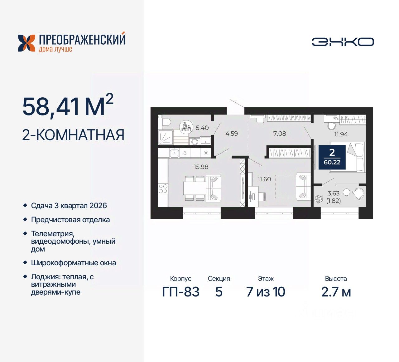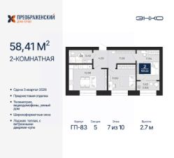 2-комн. квартира с предчистовой отделкой в ЖК "Преображенский" на 7 этаже. Общая площадь: 58.41 кв.м., жилая: 23.54 кв.м., площадь просторной кухни-столовой: 15.98 кв.м. Комнаты изолированные, все окна выходят на одну сторону. В квартире одна лоджия, один совмещенный санузел. Высота потолков 2.7 м.