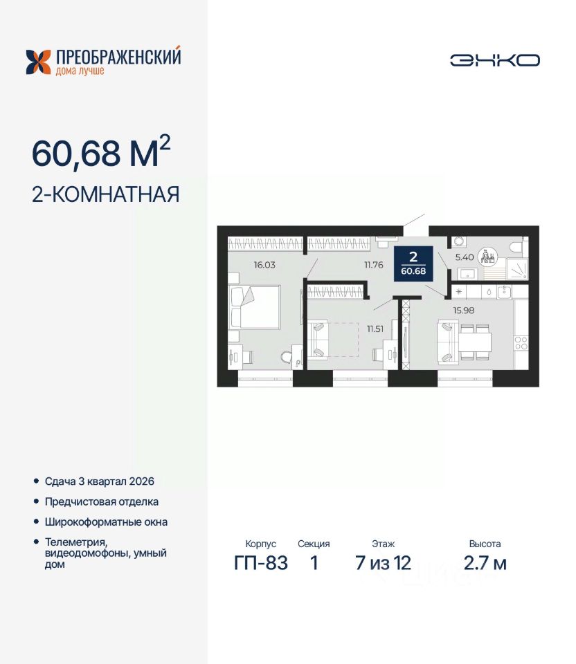 Просторная 2-комн. квартира с предчистовой отделкой в ЖК "Преображенский" на 7 этаже. Общая площадь: 60.68 кв.м., жилая: 27.54 кв.м., площадь просторной кухни-столовой: 15.98 кв.м. Комнаты изолированные, все окна выходят на одну сторону. В квартире один совмещенный санузел. Высота потолков 2.7 м.