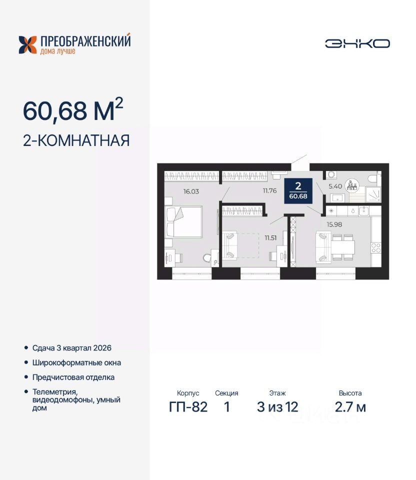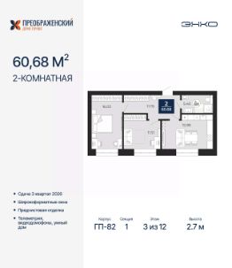 2-комн. квартира от застройщика с предчистовой отделкой в ЖК "Преображенский" на 3 этаже. Общая площадь: 60.68 кв.м., жилая: 27.54 кв.м., площадь просторной кухни-столовой: 15.98 кв.м. Комнаты изолированные, все окна выходят на одну сторону. В квартире один совмещенный санузел. Высота потолков 2.7 м.