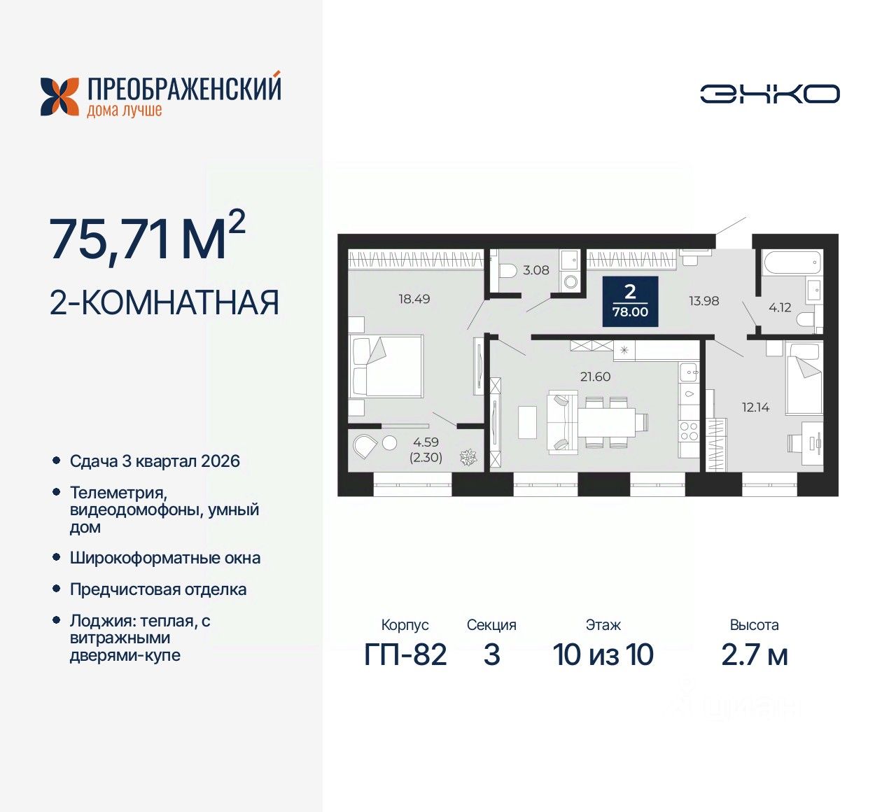Продается 2-комн. квартира с предчистовой отделкой в ЖК "Преображенский" на 10 этаже. Общая площадь: 75.71 кв.м., жилая: 30.63 кв.м., площадь просторной кухни-столовой: 21.6 кв.м. Комнаты изолированные, все окна выходят на одну сторону. В квартире одна лоджия, один совмещенный и один раздельный санузел. Высота потолков 2.7 м.