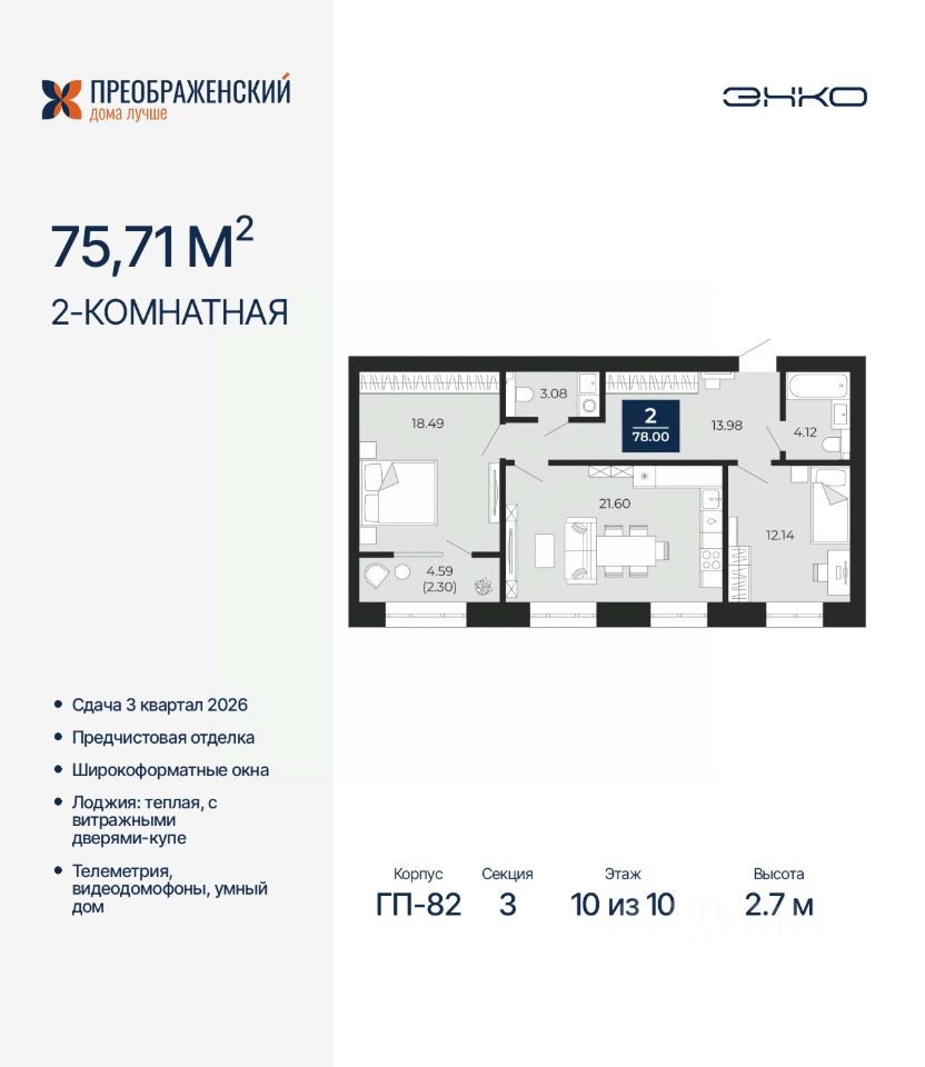 2-комн. квартира от застройщика с предчистовой отделкой в ЖК "Преображенский" на 10 этаже. Общая площадь: 75.71 кв.м., жилая: 30.63 кв.м., площадь просторной кухни-столовой: 21.6 кв.м. Комнаты изолированные, все окна выходят на одну сторону. В квартире одна лоджия, один совмещенный и один раздельный санузел. Высота потолков 2.7 м.