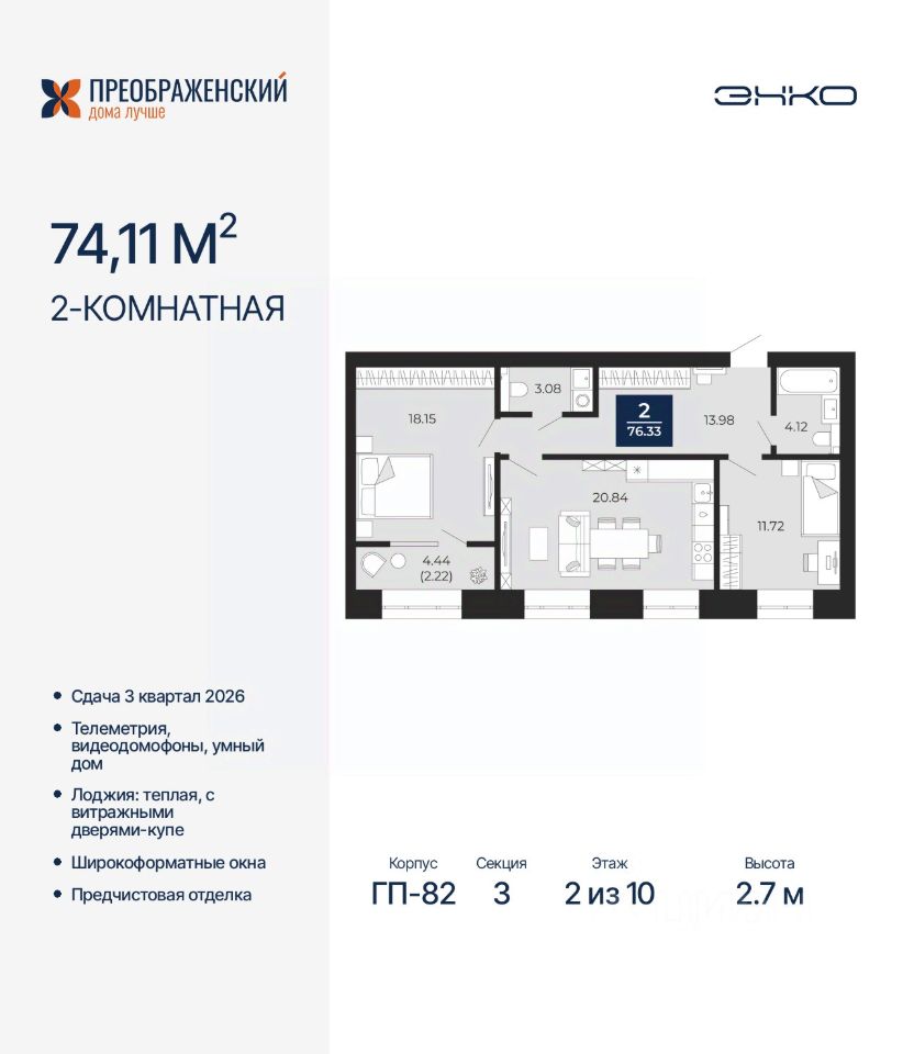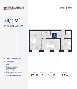 2-комн. квартира с предчистовой отделкой в ЖК "Преображенский" на 2 этаже. Общая площадь: 74.11 кв.м., жилая: 29.87 кв.м., площадь просторной кухни-столовой: 20.84 кв.м. Комнаты изолированные, все окна выходят на одну сторону. В квартире одна лоджия, один совмещенный и один раздельный санузел. Высота потолков 2.7 м.