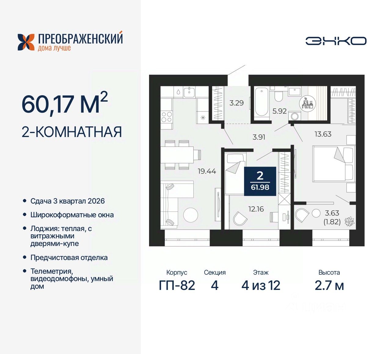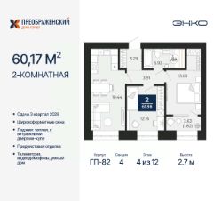 Просторная 2-комн. квартира с предчистовой отделкой в ЖК "Преображенский" на 4 этаже. Общая площадь: 60.17 кв.м., жилая: 25.79 кв.м., площадь просторной кухни-столовой: 19.44 кв.м. Комнаты изолированные, все окна выходят на одну сторону. В квартире одна лоджия, один совмещенный санузел. Высота потолков 2.7 м.