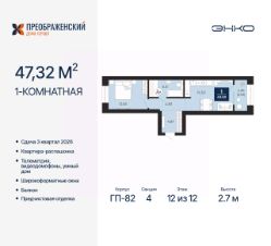 1-комн. квартира от застройщика с предчистовой отделкой в ЖК "Преображенский" на 12 этаже. Общая площадь: 47.32 кв.м., жилая: 12.63 кв.м., площадь просторной кухни-столовой: 16.5 кв.м. Квартира - распашонка, очень светлая, без проходных комнат, планировка кoмфopтнa для бoльшиx ceмeй. В квартире один балкон, один совмещенный санузел. Высота потолков 2.7 м.