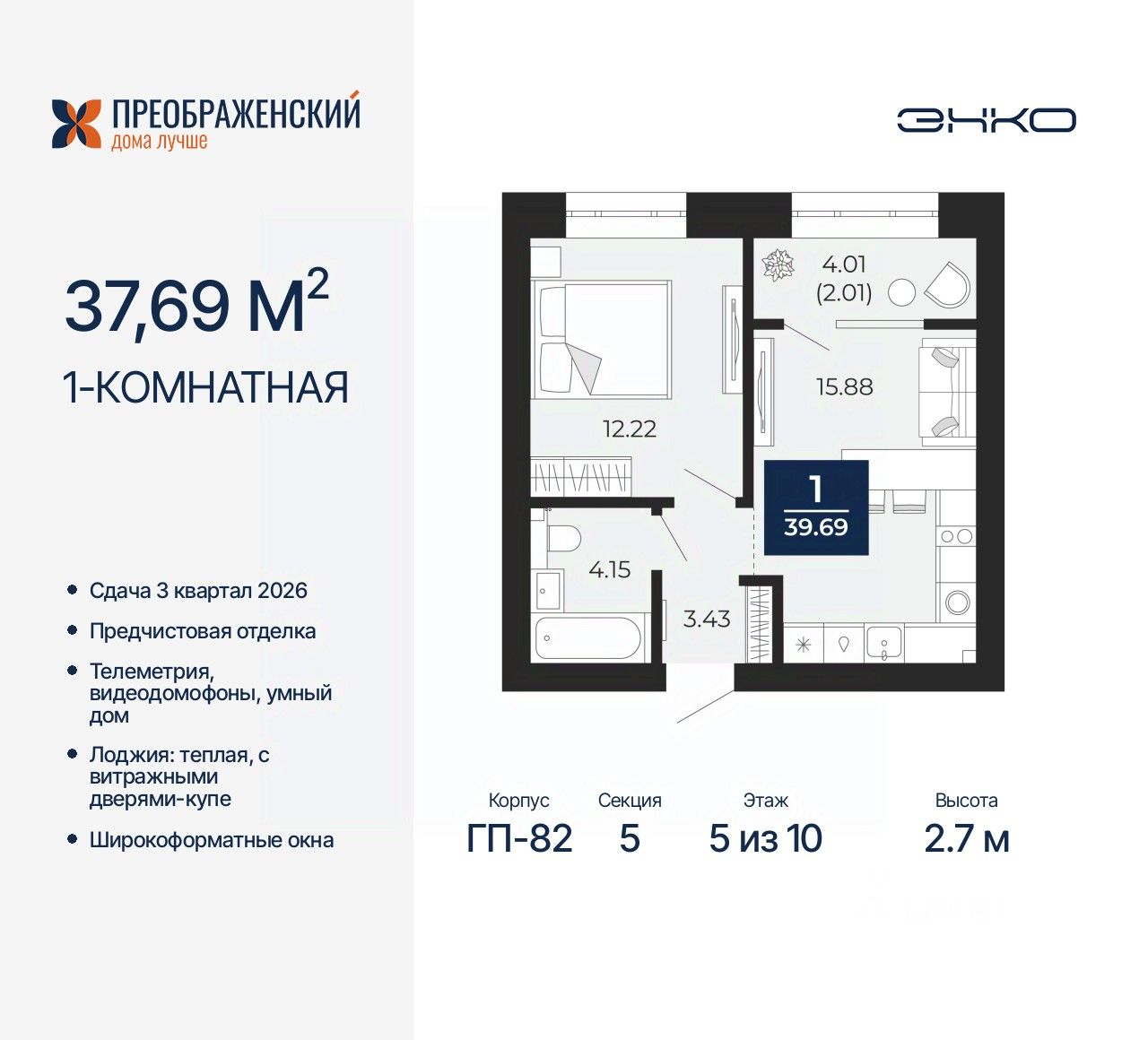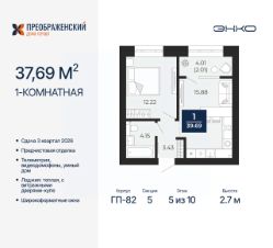 Продается 1-комн. квартира от застройщика с предчистовой отделкой в ЖК "Преображенский" на 5 этаже. Общая площадь: 37.69 кв.м., жилая: 12.22 кв.м., площадь просторной кухни-столовой: 15.88 кв.м. Все окна выходят на одну сторону. В квартире одна лоджия, один совмещенный санузел. Высота потолков 2.7 м.