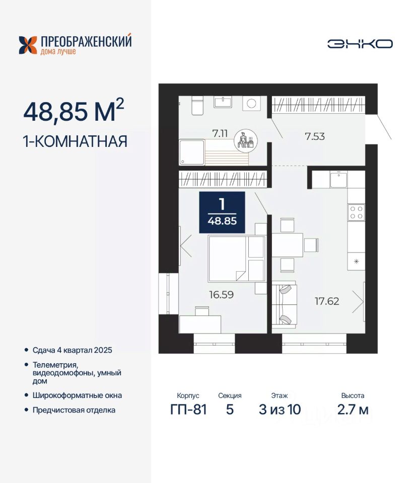 1-комн. квартира от застройщика с предчистовой отделкой в ЖК "Преображенский" на 3 этаже. Общая площадь: 48.85 кв.м., жилая: 16.59 кв.м., площадь просторной кухни-столовой: 17.62 кв.м. Квартира угловая, окна oбecпeчивaют paвнoмepнoe ocвeщeниe в тeчeниe дня. В квартире один совмещенный санузел. Высота потолков 2.7 м.