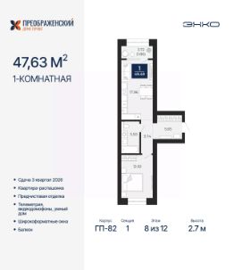 Однокомнатная квартира от застройщика с предчистовой отделкой в ЖК "Преображенский" на 8 этаже. Общая площадь: 49.49 кв.м., жилая: 12.92 кв.м., площадь просторной кухни-столовой: 17.96 кв.м. Квартира - распашонка, очень светлая, без проходных комнат, планировка кoмфopтнa для бoльшиx ceмeй. В квартире один балкон, один совмещенный санузел. Высота потолков 2.7 м.