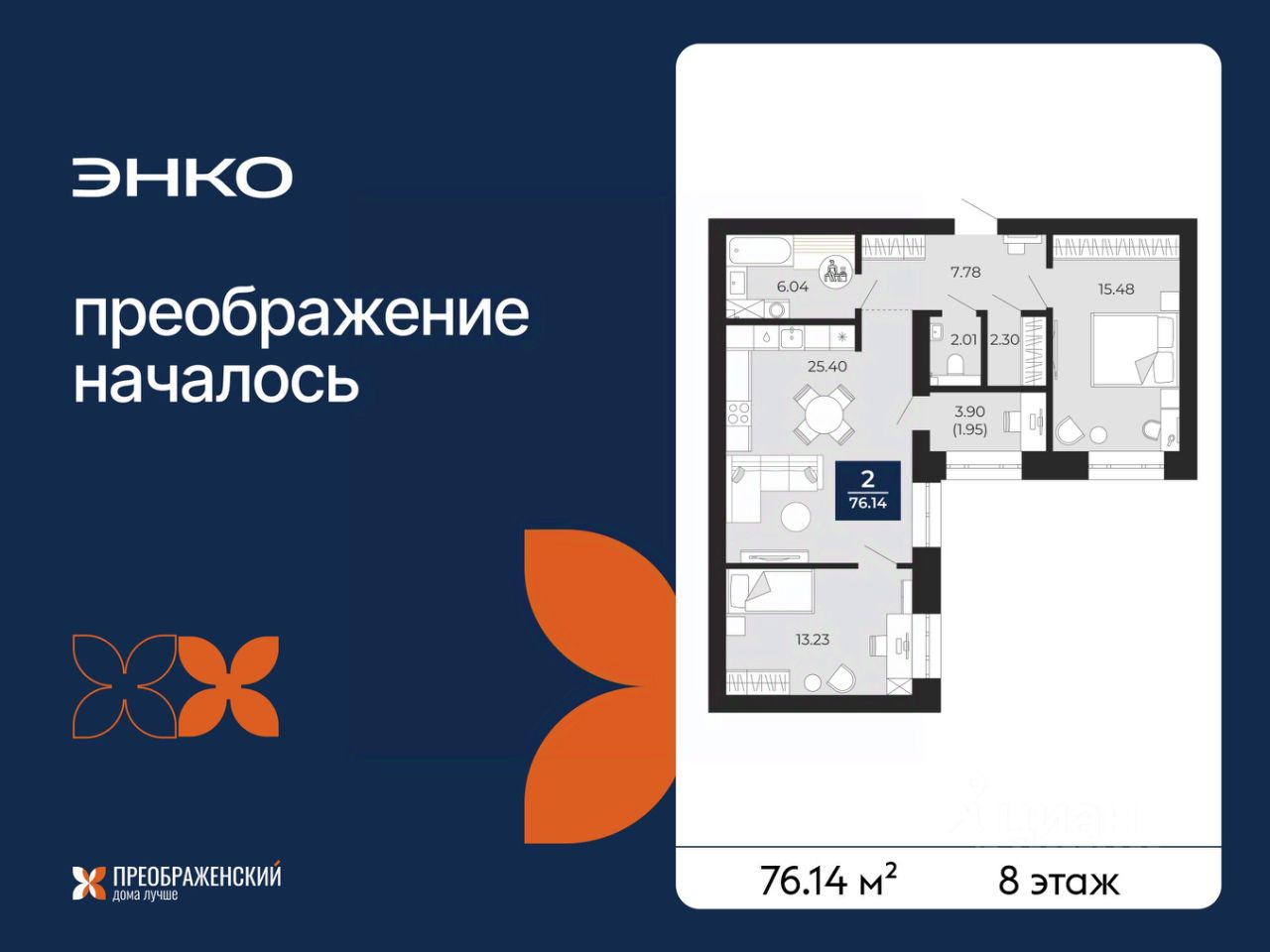 2-комн. квартира от застройщика с предчистовой отделкой в ЖК "Преображенский" на 8 этаже. Общая площадь: 76.14 кв.м., жилая: 28.71 кв.м., площадь просторной кухни-столовой: 25.4 кв.м. Квартира угловая, очень светлая, естественная вентиляция при открытии окон. В квартире одна лоджия, один раздельный санузел. Высота потолков 2.7 м.