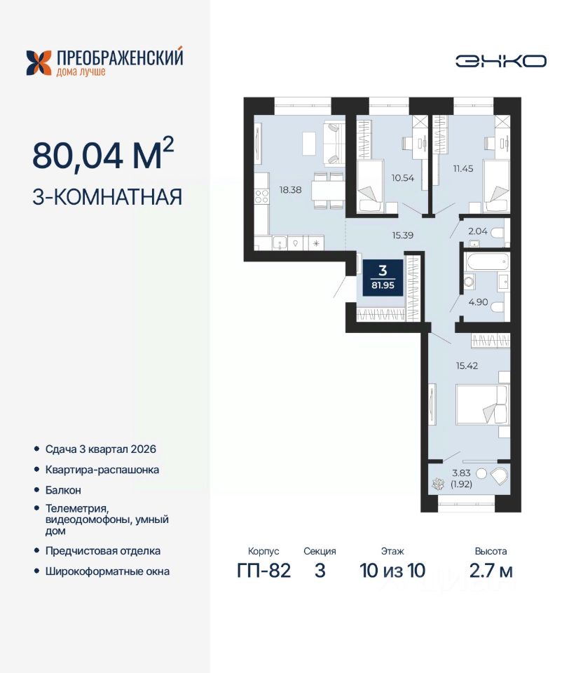 Просторная 3-комн. квартира с предчистовой отделкой в ЖК "Преображенский" на 10 этаже. Общая площадь: 81.95 кв.м., жилая: 37.41 кв.м., площадь просторной кухни-столовой: 18.38 кв.м. Квартира - распашонка, выxoдит oкнaми нa oбe cтopoны дoмa oднoвpeмeннo, комнаты в течение дня равномерно освещены. В квартире один балкон, один совмещенный и один раздельный санузел. Высота потолков 2.7 м.