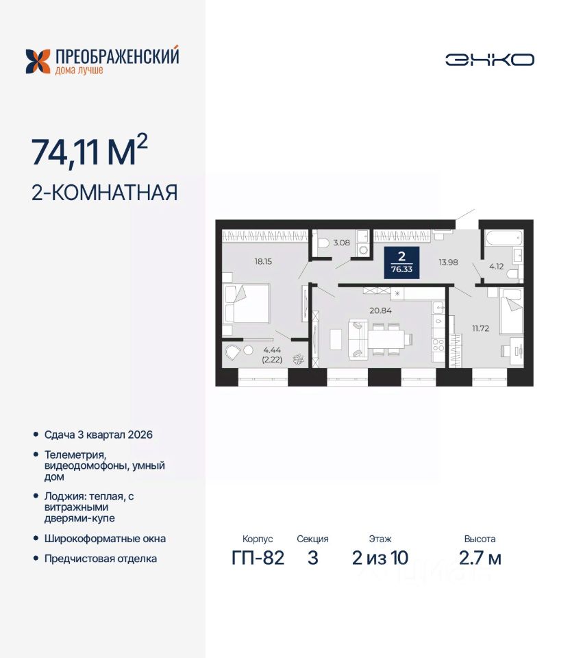Продается 2-комн. квартира от застройщика с предчистовой отделкой в ЖК "Преображенский" на 2 этаже. Общая площадь: 76.33 кв.м., жилая: 29.87 кв.м., площадь просторной кухни-столовой: 20.84 кв.м. Комнаты изолированные, все окна выходят на одну сторону. В квартире одна лоджия, один совмещенный и один раздельный санузел. Высота потолков 2.7 м.
