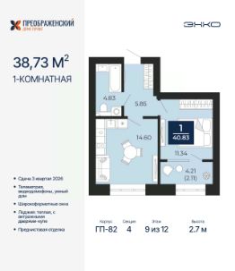 Однокомнатная квартира от застройщика с предчистовой отделкой в ЖК "Преображенский" на 9 этаже. Общая площадь: 40.83 кв.м., жилая: 11.34 кв.м., площадь просторной кухни-столовой: 14.6 кв.м. Все окна выходят на одну сторону. В квартире одна лоджия, один совмещенный санузел. Высота потолков 2.7 м.