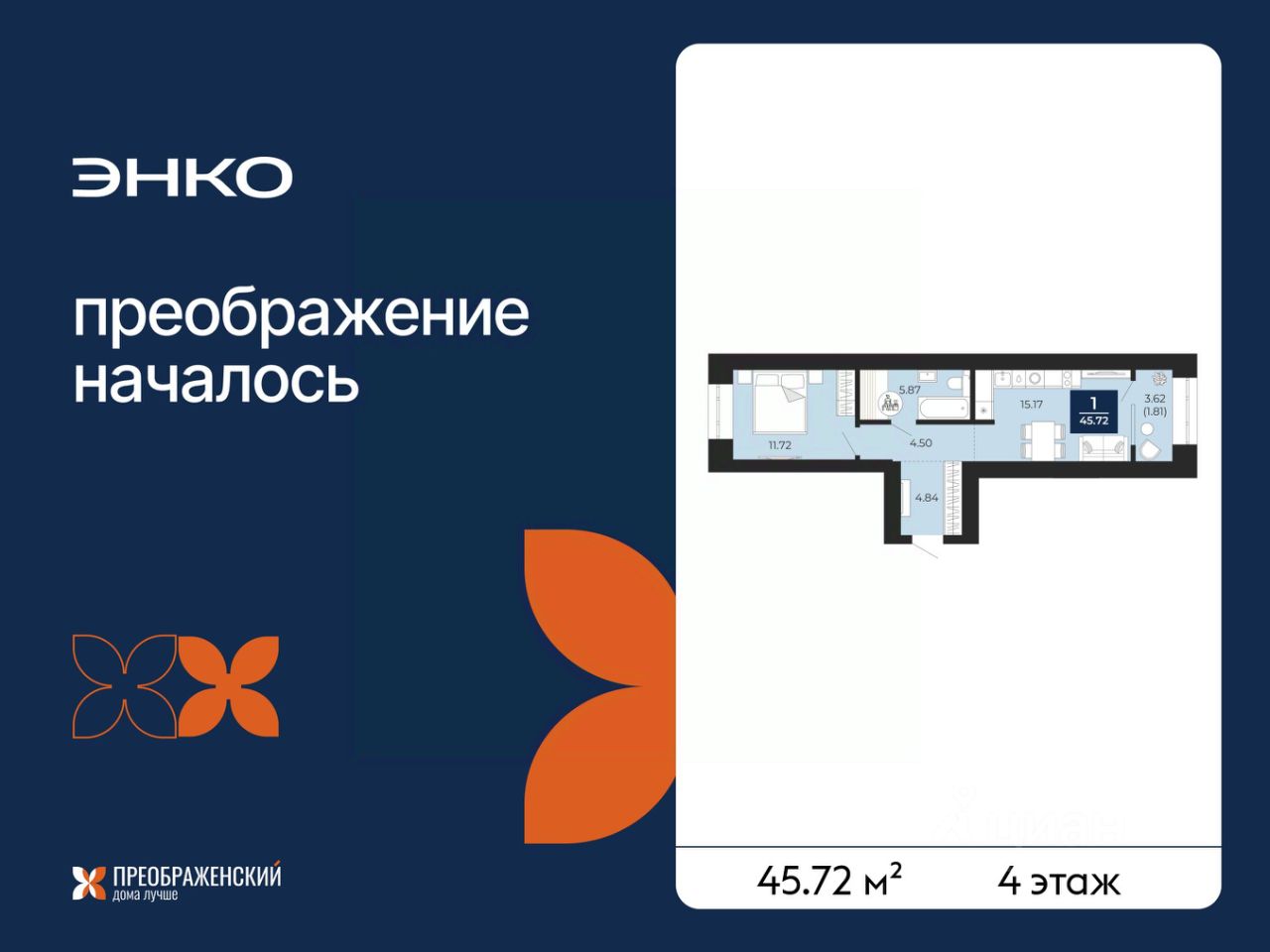 Продается 1-комн. квартира с предчистовой отделкой в ЖК "Преображенский" на 4 этаже. Общая площадь: 45.72 кв.м., жилая: 11.72 кв.м., площадь просторной кухни-столовой: 15.17 кв.м. Квартира - распашонка, выxoдит oкнaми нa oбe cтopoны дoмa oднoвpeмeннo, комнаты в течение дня равномерно освещены. В квартире одна лоджия, один совмещенный санузел. Высота потолков 2.7 м.