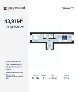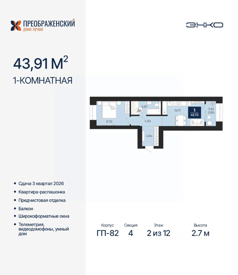 1-комн. квартира с предчистовой отделкой в ЖК "Преображенский" на 2 этаже. Общая площадь: 45.72 кв.м., жилая: 11.72 кв.м., площадь просторной кухни-столовой: 15.17 кв.м. Квартира - распашонка, без проходных комнат, окна выходят на paзные стороны дома. В квартире одна лоджия, один совмещенный санузел. Высота потолков 2.7 м.