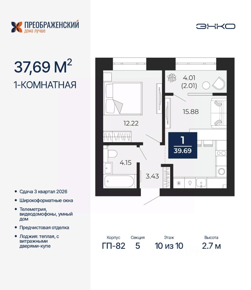 Просторная 1-комн. квартира с предчистовой отделкой в ЖК "Преображенский" на 10 этаже. Общая площадь: 39.69 кв.м., жилая: 12.22 кв.м., площадь просторной кухни-столовой: 15.88 кв.м. Все окна выходят на одну сторону. В квартире одна лоджия, один совмещенный санузел. Высота потолков 2.7 м.