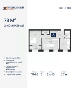 Просторная 2-комн. квартира с предчистовой отделкой в ЖК "Преображенский" на 5 этаже. Общая площадь: 78 кв.м., жилая: 30.63 кв.м., площадь просторной кухни-столовой: 21.6 кв.м. Комнаты изолированные, все окна выходят на одну сторону. В квартире одна лоджия, один совмещенный и один раздельный санузел. Высота потолков 2.7 м.