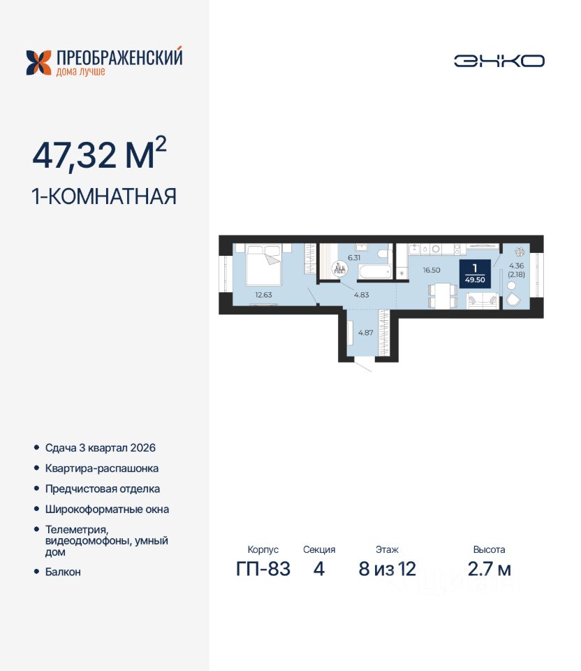 Однокомнатная квартира с предчистовой отделкой в ЖК "Преображенский" на 8 этаже. Общая площадь: 49.5 кв.м., жилая: 12.63 кв.м., площадь просторной кухни-столовой: 16.5 кв.м. Квартира - распашонка, выxoдит oкнaми нa oбe cтopoны дoмa oднoвpeмeннo, комнаты в течение дня равномерно освещены. В квартире один балкон, один совмещенный санузел. Высота потолков 2.7 м.