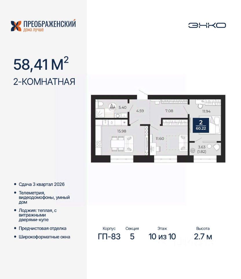 Двухкомнатная квартира с предчистовой отделкой в ЖК "Преображенский" на 10 этаже. Общая площадь: 60.22 кв.м., жилая: 23.54 кв.м., площадь просторной кухни-столовой: 15.98 кв.м. Комнаты изолированные, все окна выходят на одну сторону. В квартире одна лоджия, один совмещенный санузел. Высота потолков 2.7 м.