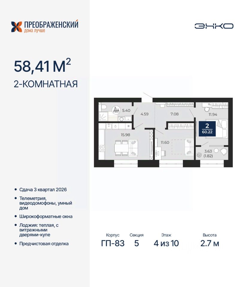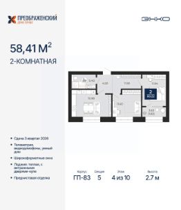 2-комн. квартира с предчистовой отделкой в ЖК "Преображенский" на 4 этаже. Общая площадь: 60.22 кв.м., жилая: 23.54 кв.м., площадь просторной кухни-столовой: 15.98 кв.м. Комнаты изолированные, все окна выходят на одну сторону. В квартире одна лоджия, один совмещенный санузел. Высота потолков 2.7 м.