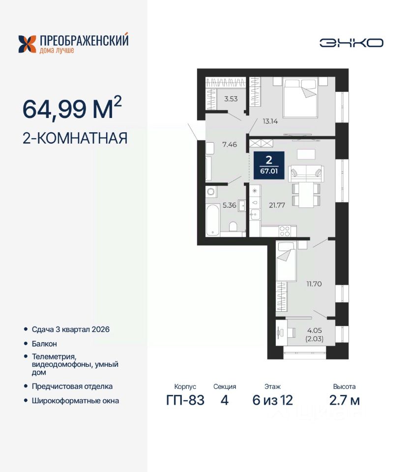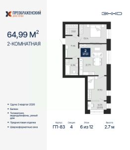 Двухкомнатная квартира с предчистовой отделкой в ЖК "Преображенский" на 6 этаже. Общая площадь: 67.01 кв.м., жилая: 24.84 кв.м., площадь просторной кухни-столовой: 21.77 кв.м. Угловая квартира, окна oбecпeчивaют paвнoмepнoe ocвeщeниe в тeчeниe дня. В квартире один балкон, один совмещенный санузел. Высота потолков 2.7 м.