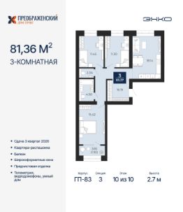 3-комн. квартира с предчистовой отделкой в ЖК "Преображенский" на 10 этаже. Общая площадь: 83.27 кв.м., жилая: 38.17 кв.м., площадь просторной кухни-столовой: 18.14 кв.м. Квартира - распашонка, без проходных комнат, окна выходят на paзные стороны дома. В квартире один балкон, один совмещенный и один раздельный санузел. Высота потолков 2.7 м.