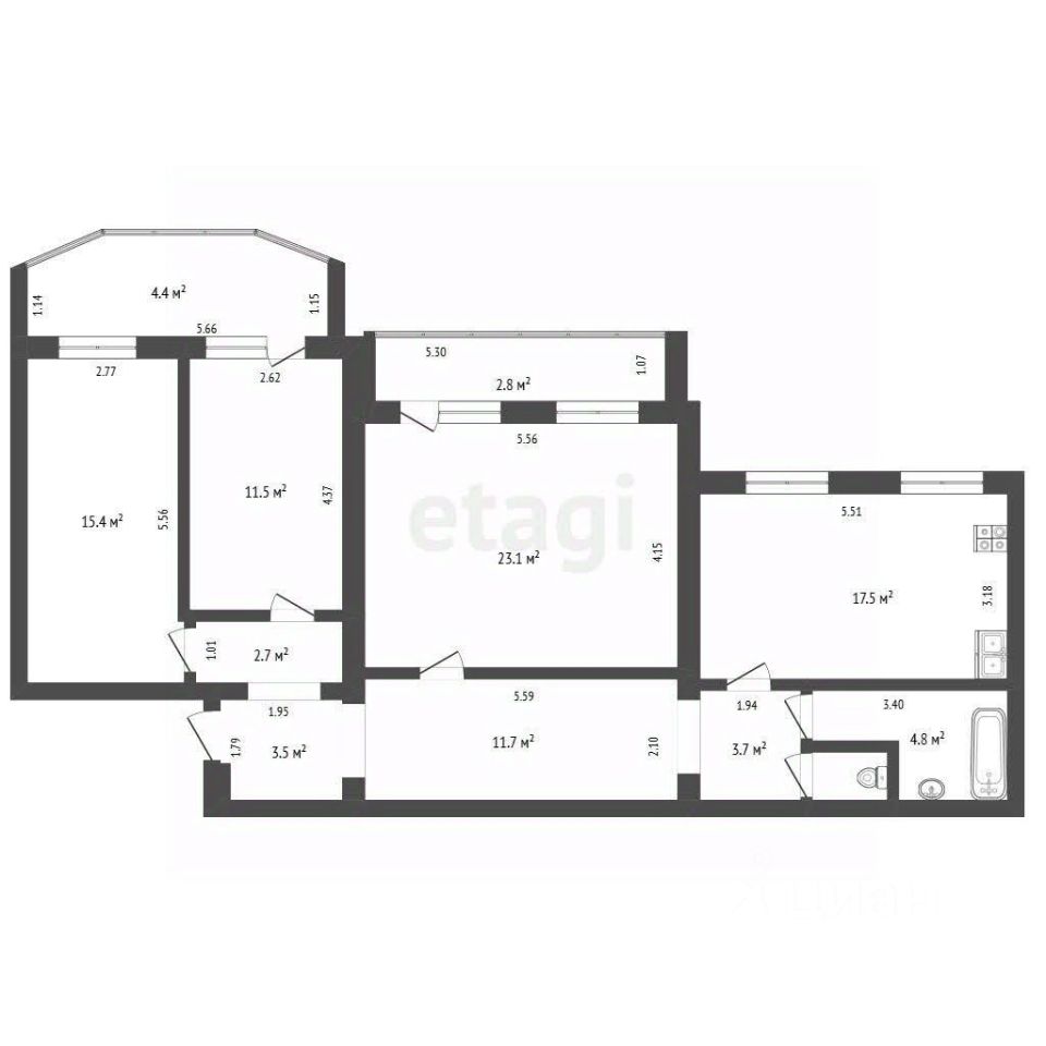• Спальни: 15,4 кв.м., 11,5 кв.м. и 23,1 кв.м.;