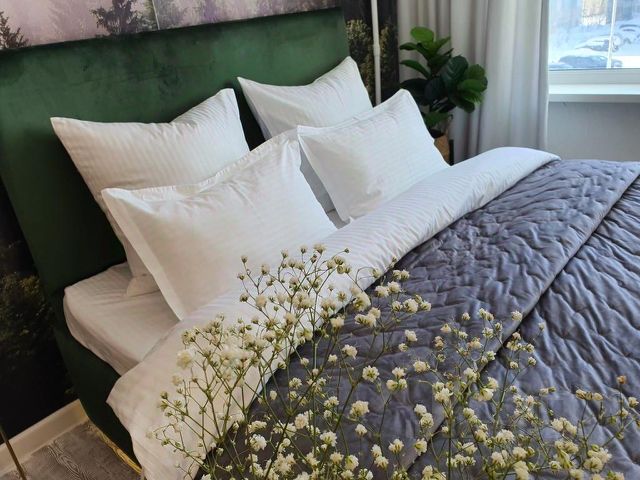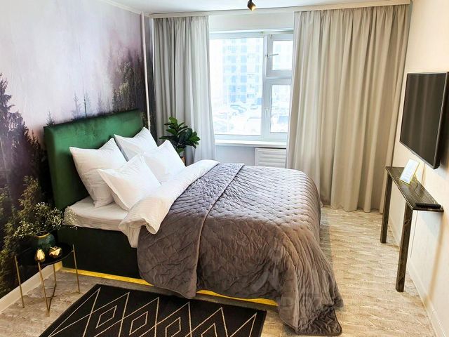 Изюминкой квартиры стала большая удобная кровать с мягким изголовьем, уютный диван с пледом и подушками, где вы сможете устроиться с книжкой или посмотреть любимый фильм по телевизору.